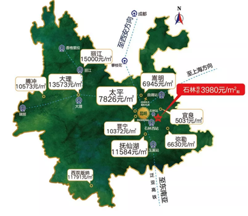 而且,石林还是昆明周边少有有高铁接入的3字头千元房价郊县,虽然距离昆明78公里,但18分钟的高铁车程即可抵达昆明,自驾仅需要一小时。