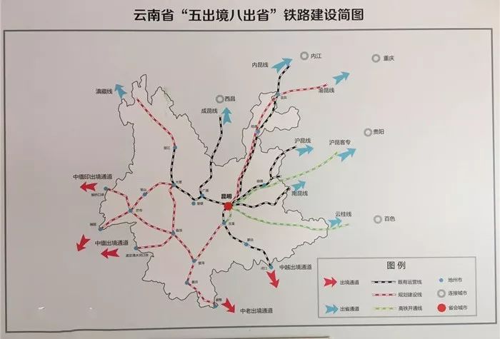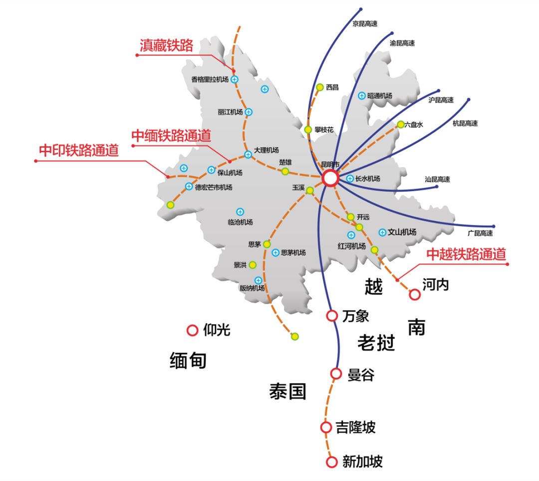 高铁方面,以昆明为中心前往北京、广州、深圳、香港等一线城市均有直达,从昆明到重庆仅需4小时,到南宁4.6小时,到成都5.5小时,到最近的省会贵阳只要2小时。
