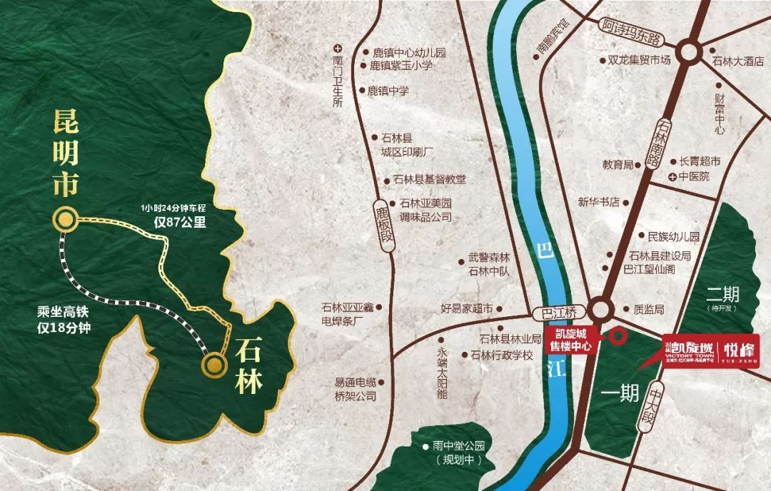 凯旋城位于石林核心区域,离财富中心、石林冰雪世界、国家5A级石林风景区、长湖风景区环伺四周,坐上高铁18分钟即达昆明,在享受城市生活的同时,也可以周末去休闲度假,可谓离尘不离城。