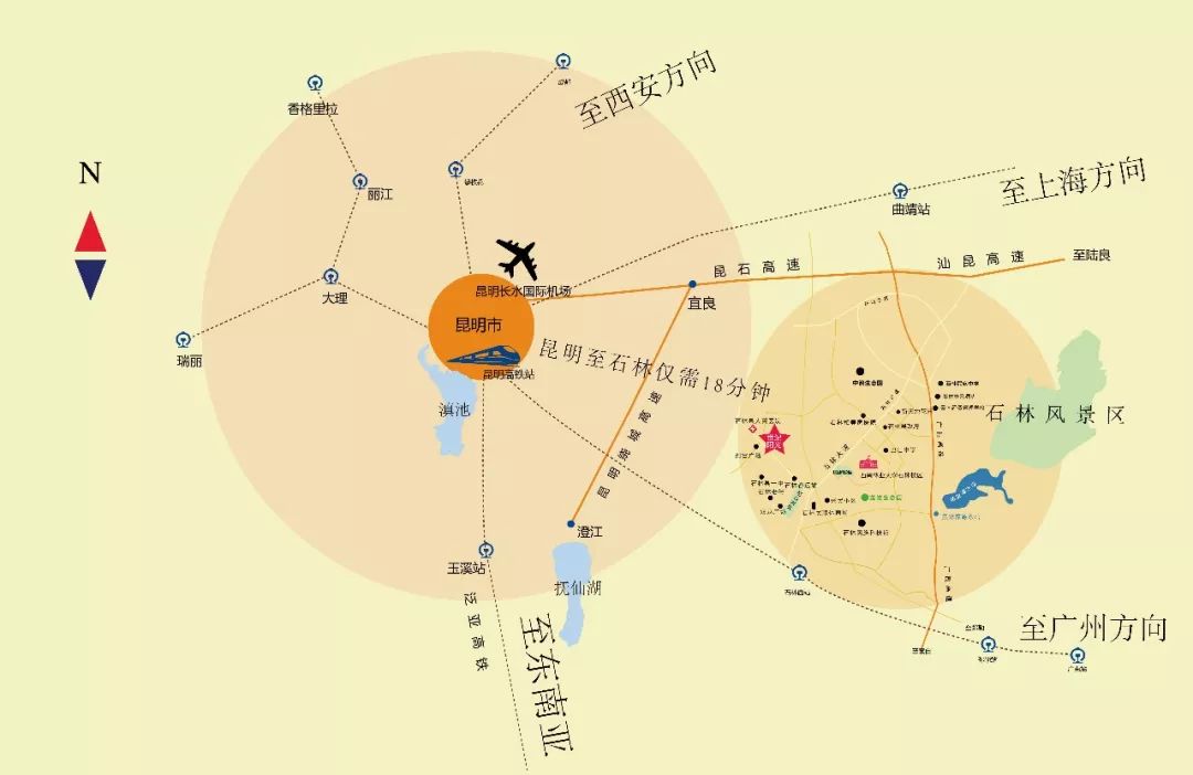 石林位于距离昆明高铁18分钟的地方,被称为昆明的后花园。昆明之于云南,如同雄安之于北京,而石林之于昆明,如同户县之于西安。石林区位优势明显,位于昆明1小时经济圈内,通过高铁无缝对接5大国内高铁,直达18省市,泛亚高铁连接东南亚多个城市。