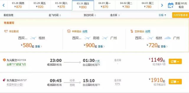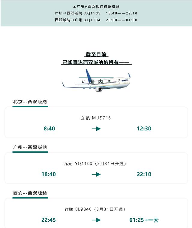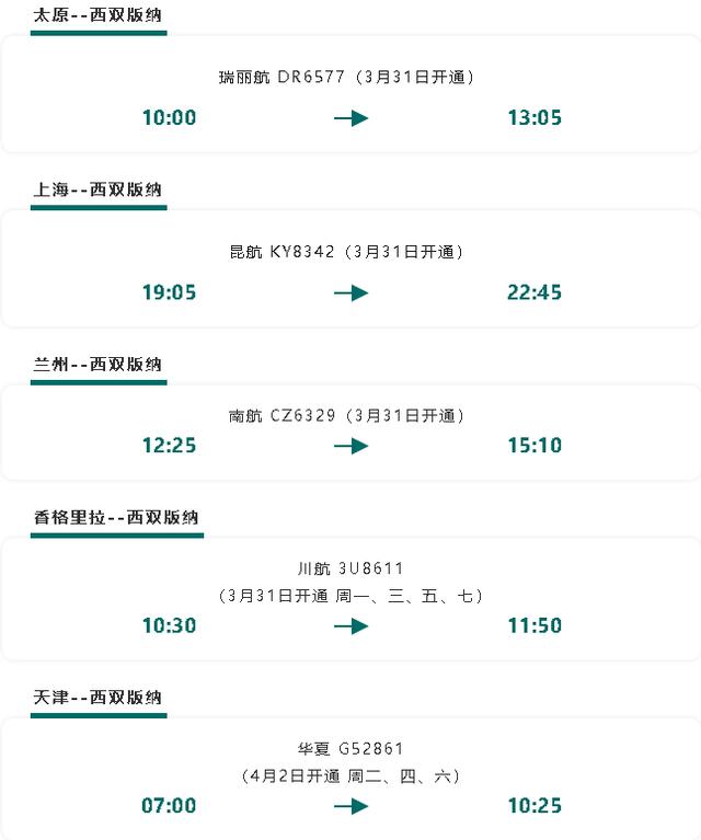 3月31日,太原⇌西双版纳,上海⇌西双版纳,广州⇌西双版纳,西安⇌西双版纳,兰州⇌西双版纳,香格里拉⇌西双版纳
