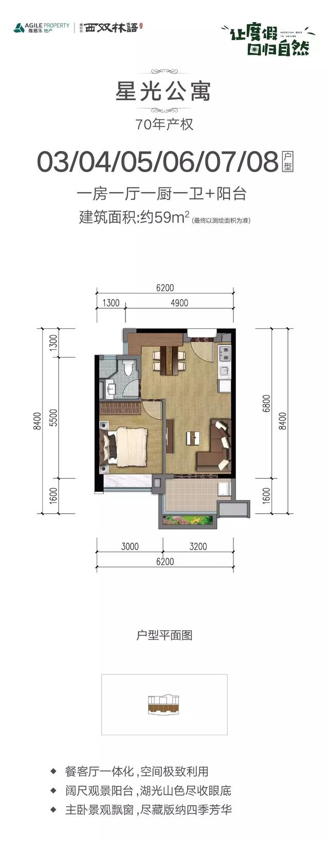 约40-59㎡星光公寓,是拥有70年产权的小户型公寓,品质精装,百变空间带观景阳台,商业配套优越,是度假旅居人群的居住优选,分享西双版纳未来红利,可谓自住投资两相宜。