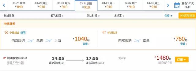 西双版纳→上海 KY8341 14:05——17:55