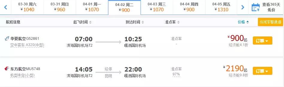 4月2日,天津⇌西双版纳