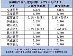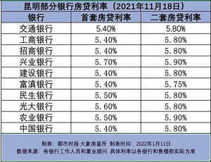 2021年11月18日,都市时报·大象房鉴所曾报道过昆明部分银行房贷利率下调的消息。当时,昆明首套房的贷款利率基本在5.4%以上,较高的是兴业银行,达到5.7%。二套房利率大多为5.8%。