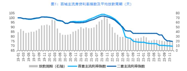 贝壳研究院监测显示,2023年12月百城首套主流房贷利率平均为3.86%,二套主流房贷利率平均为4.41%,分别较上月微降低1BP、2BP。12月首套、二套主流房贷利率较去年同期分别回落23BP和50BP。本月银行平均放款周期为19天,与上月持平,维持2019年以来最快放款速度。
