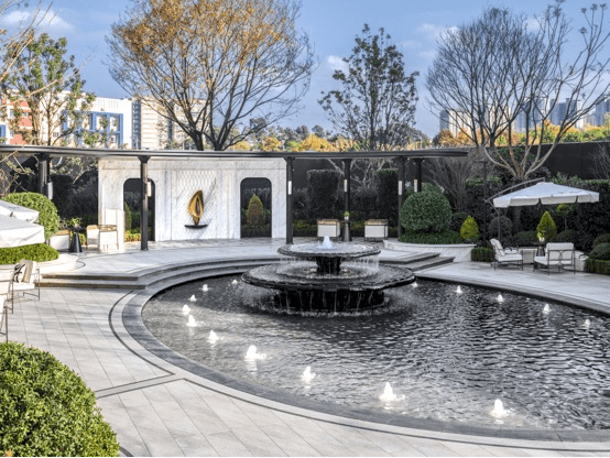 项目自面世以来,便把高定的氛围演绎的十分到位,从踏入景观园区的第一步就能直观感受到。定制的拼花地面与奢石景墙,传递出的奢贵感当你置身其中便能感知。景观花园则以国际园艺大师卢西亚诺的花园为灵感打造的园林景观,布局约4500㎡梦幻中庭+约1800㎡分龄奇趣园林,整体以黑白灰作为基调,打造了一座法式庄园。