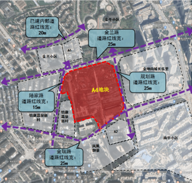 东临规划路,南至金瑞路,西至陆家路,北至金兰路,项目净用地面积为43504.62平方米(约65.26亩),用地性质为R2-二类居住用地,拟建设10栋高层住宅及配套商业。