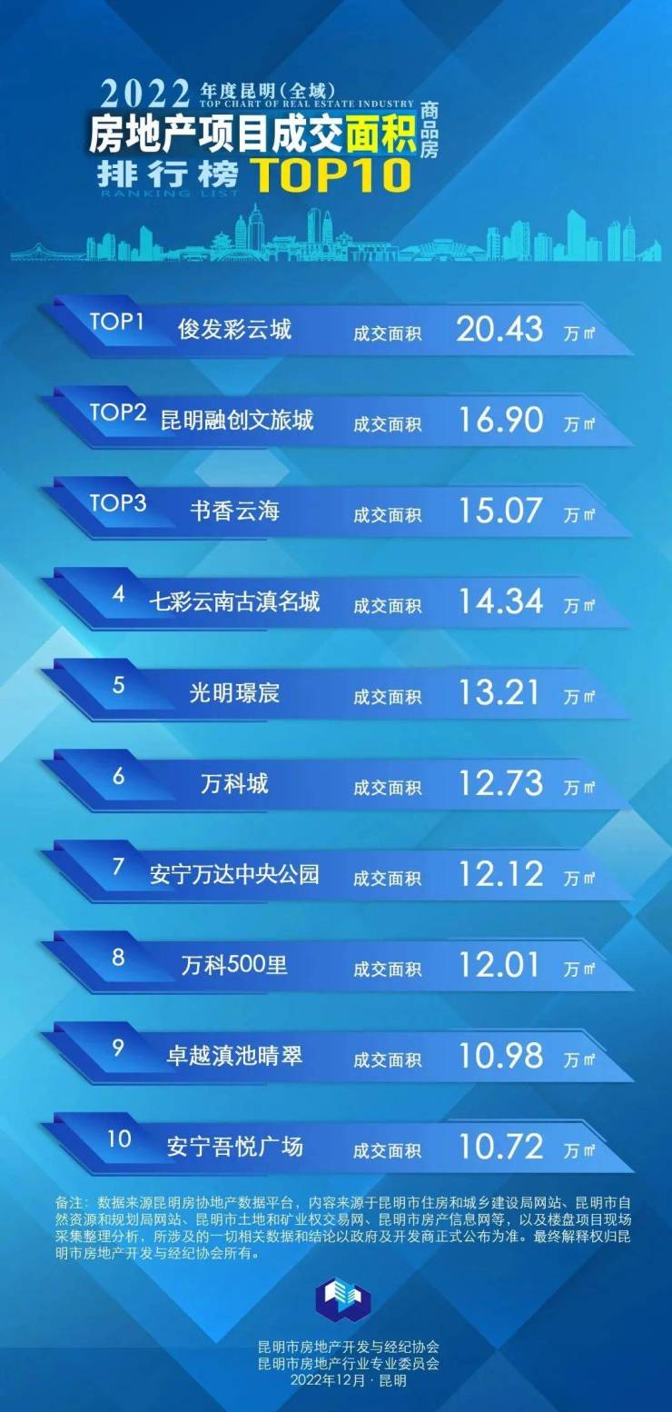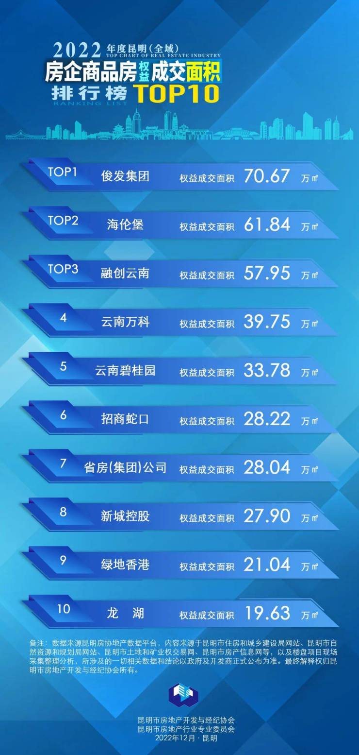今日发布“昆明2022年度房企(权益)商品房成交面积TOP10”、“昆明2022年度房地产项目(商品房)成交金额TOP10”和“昆明2022年度房地产项目(商品房)成交面积TOP10”。