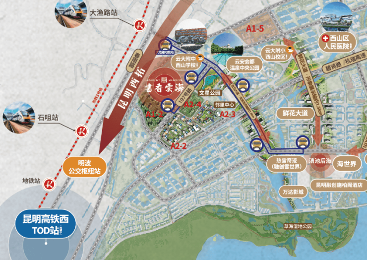 2024年华发书香云海美好升级年,教育配套再升级:主动协商代建小学部,计划年内动工;社区内部昆明头部品牌的幼儿园也已动工;素质教育培训机构持续进驻…随着链接昆明文旅城和华发书香云海的道路开通,草海也将更进一步,最近的一条实际距离仅608米,预计2024年中通车。