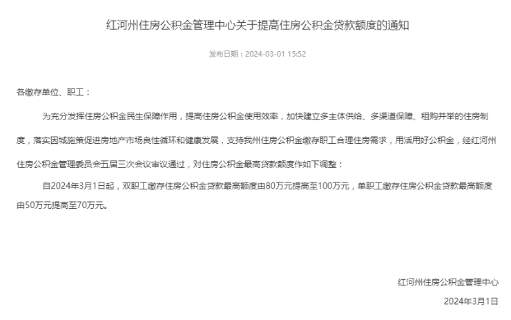 红河州住房公积金管理中心发布《红河州住房公积金管理中心关于提高住房公积金贷款额度的通知》,自2024年3月1日起,双职工缴存住房公积金贷款最高额度由80万元提高至100万元,单职工缴存住房公积金贷款最高额度由50万元提高至70万元。