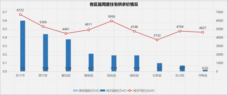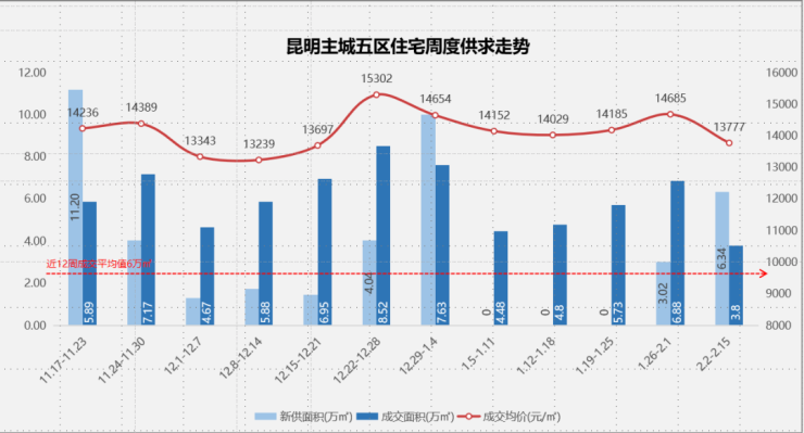 本周住宅新增供应6.34万㎡,环比上涨110%;为万科城、中铁时代央著、海荣滇池澜庭、金泰国际及建投春城華府项目供应。