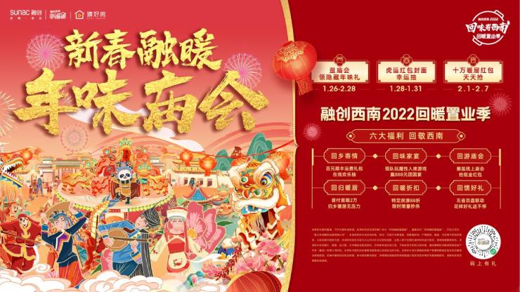 红包启运,庙会迎新,好礼馈谢,盛惠暖居。“回味寄西南”融创西南2022回暖置业季,将线上潮玩游戏互动,与线下置业体验结合,多重福利加持,诠释“回暖””内核,融创西南期待与宁新春融暖,共赴美好2022。