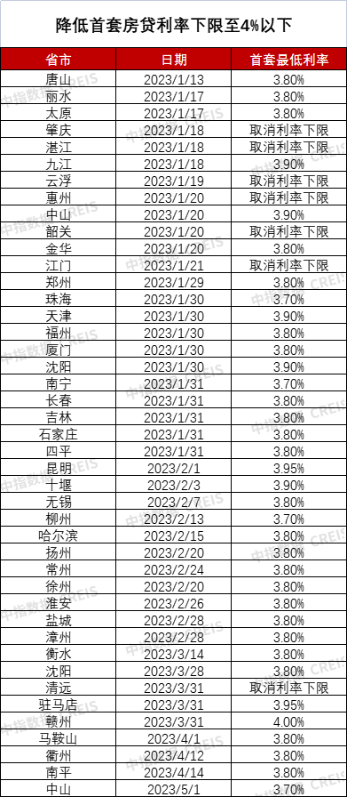 值得一提的是,今年1月5日,人民银行、银保监会发布通知,决定建立首套住房贷款利率政策动态调整机制。新建商品住宅销售价格环比和同比连续3个月均下降的城市,可阶段性维持、下调或取消当地首套住房贷款利率政策下限。根据中指监测数据,今年以来已有超40城降低首套房贷利率下限至4%以下。