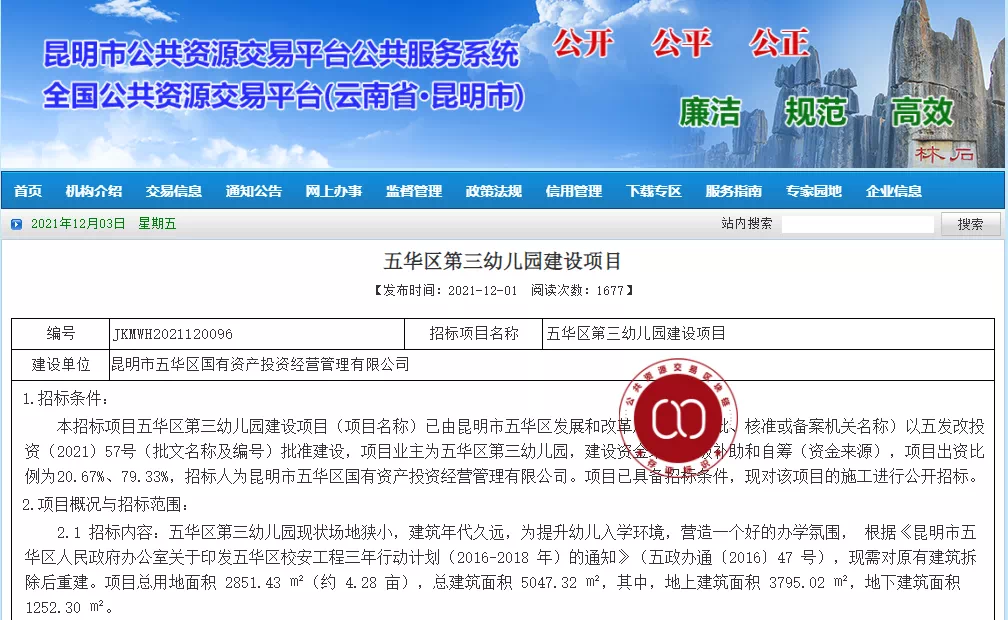 12月1日,昆明市公共资源交易中心发布了“五华区第三幼儿园建设项目招标公告”。