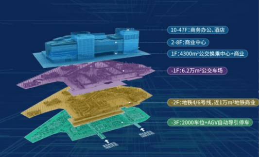 同时,负二层新建了地铁4号线和6号线的换乘站,方便市民乘坐地铁、搭乘高铁和飞机;负三层的话,是智能停车场,将建设机动车停车位2500多个、非机动车停车位8000多个。