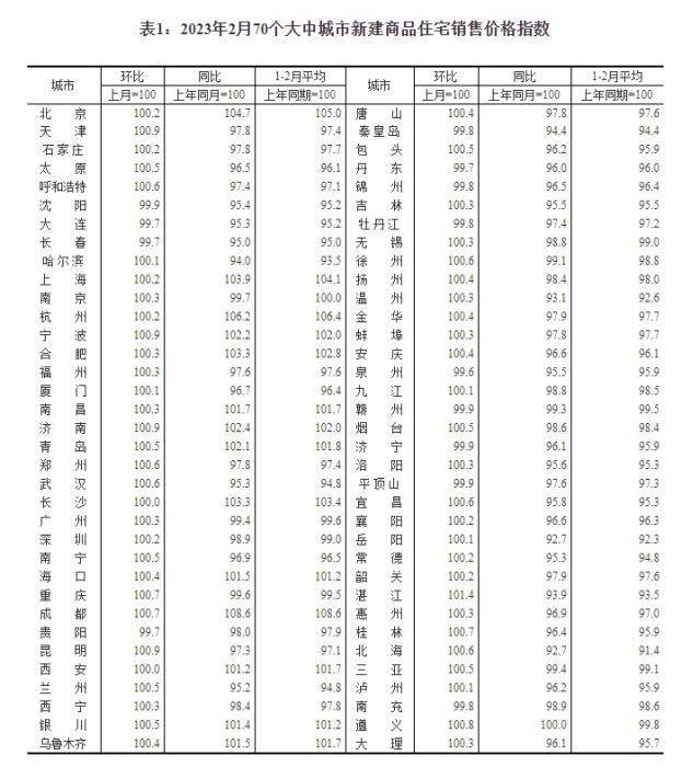 2023年2月70个大中城市新建商品住宅销售价格指数。 截图自国家统计局官网