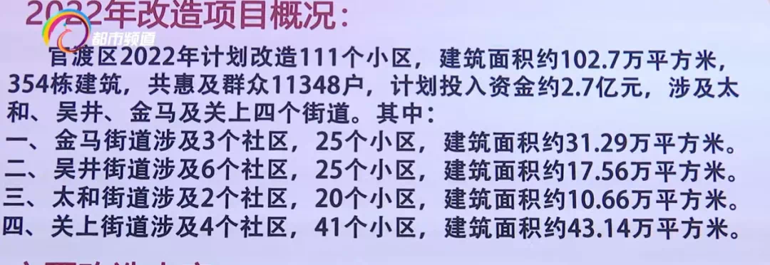 2022年,官渡区将启动改造111个小区,建筑面积约102.7万平方米,涉及354栋建筑,惠及小区居民11348户,计划投资约2.7亿元。