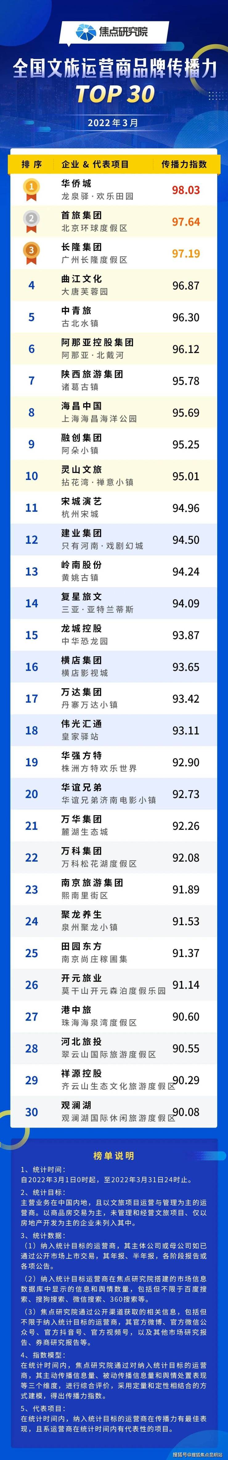 2022年3月全国文旅运营商品牌传播力TOP30出炉!