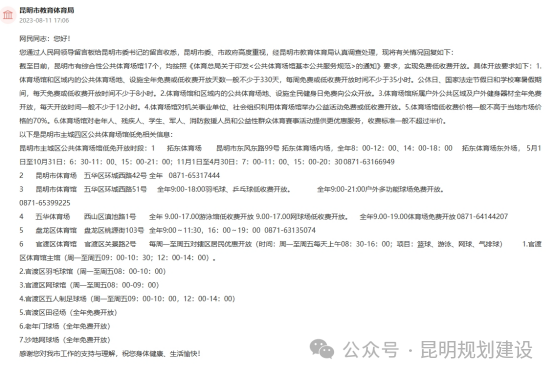 同时,昆明市积极推动公共体育场馆向社会低免开放,确保公共体育场馆全年向社会开放时间不少于330天、每周不低于35小时,场馆所属户外公共区域及器材每天开放时间不少于12小时,便于群众开展体育健身活动。