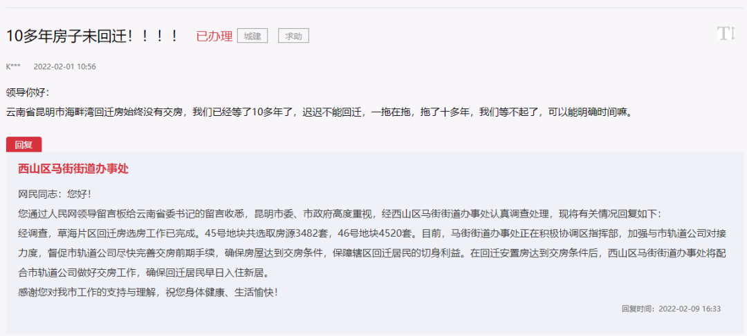 昆明一回迁房10多年未交房!官方回复