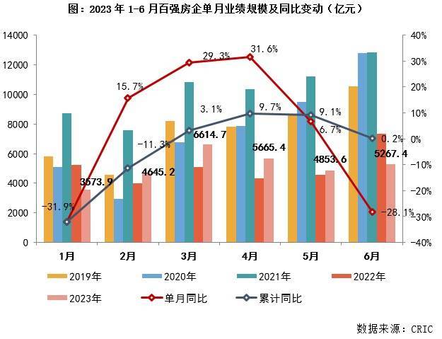 2023年1-6月,TOP 100房企实现销售操盘金额30620.2亿元,同比微增0.2%,且增幅较前两月回落明显。克而瑞认为,今年以来房地产行业虽然有一定的修复预期,但在供需两端制约之下,上半年市场和企业表现相对平淡,楼市复苏动能放缓。