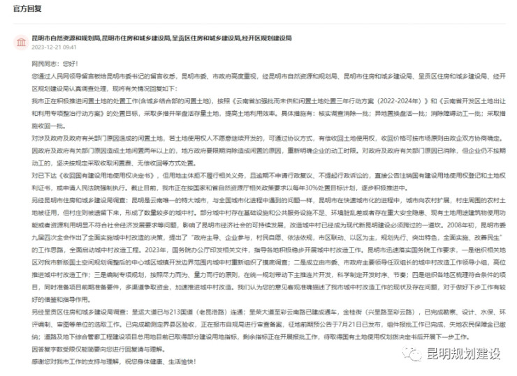 网友建议昆明加快城中村改造,处置闲置土地!官方回复啦