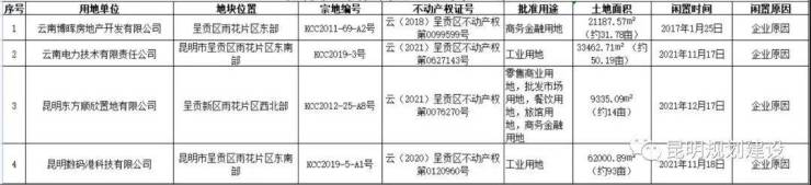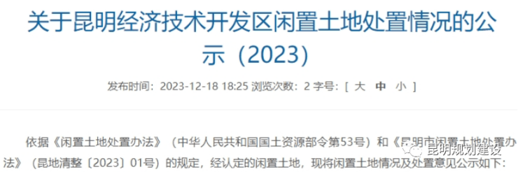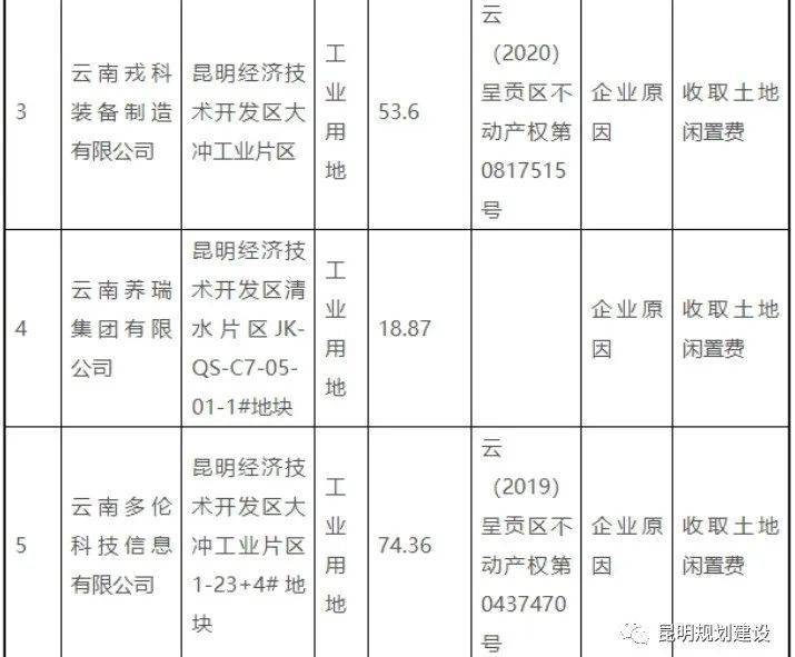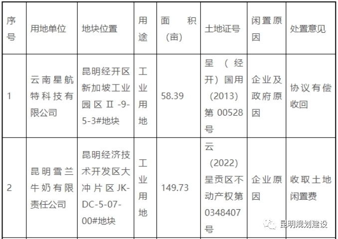 据了解,近期昆明各区自然资源管理部门加大了对闲置用地的处置力度,经开区、呈贡区又相继公布了一批闲置用地的认定情况,将采取协议有偿收回、收取土地闲置费、限期开工等措施。