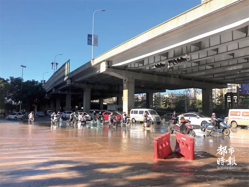 自来水公司派出的现场负责人王先生介绍,上午11点57分,公司人员接到路口执勤交警的电话后,立即带着工具赶到现场。“下午1点左右到达时路面全是积水。我们立即打开窨井盖排水,并在旁边摆上水马。因为该路段地势低,导致积水难以排出。”