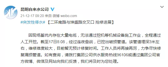 因现场基坑内存在大量电缆,无法通过挖机等机械设备施工作业,全程通过人工开挖。截至17日8:08,经过连夜奋战,已挖出破损管道。该管道埋深3米左右,维修难度较大,目前暂无预计修复时间。工作人员将再接再厉,力争尽快修复漏损管道。如有查询,请拨打集团公司供水服务热线96106或通过集团公司官方微博、微信及网站向我们反馈,我们将及时为您处理。