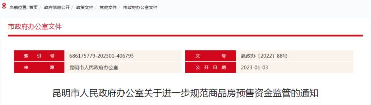 1月3日,市政府官网发布《昆明市人民政府办公室关于进一步规范商品房预售资金监管的通知》,1月1日起施行。明确住房城乡建设部门将会同监管银行对房地产开发企业的商品房预售项目预售资金实施监管,房地产开发企业须将商品房预售资金存入银行监管专用账户,实行资金全过程监管,以保障资金专款专用,维护购房人合法权益。