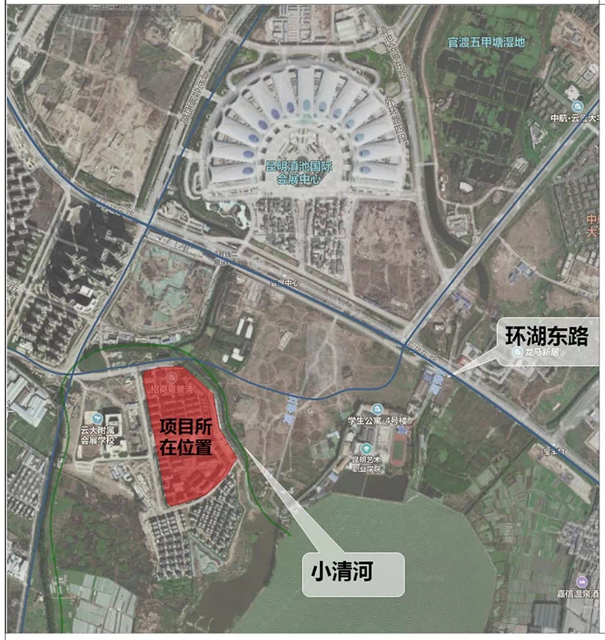项目位于昆明市官渡区六甲街道,北面为环湖东路,自东南面沿北侧到西南方为小清河所环绕,基地北临30米规划道路,西、南临18米规划道路,东临公园绿地、小清河及18米规划道路。