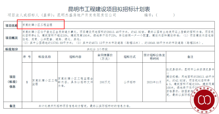 10月10日,云南省公共资源交易信息网连发三则关于京宸玖璋小区的拟招标计划表,涉及《京宸玖璋小区建筑方案及施工图设计服务》、《京宸玖璋小区室内精装修方案设计及施工图设计服务》和《京宸玖璋小区工程监理》拟招标计划。