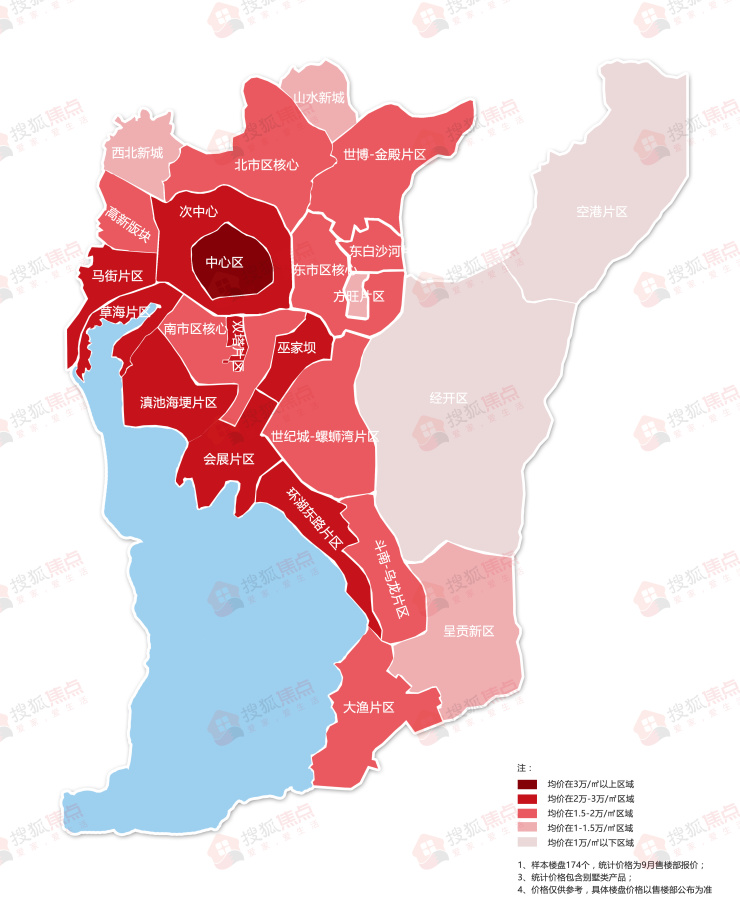 (注:区域价格由区域内楼盘价格综合计算得出,样本楼盘共174个,统计价格为售楼部9月报价,仅统计住宅产品,不含公寓价格,仅供参考。)
