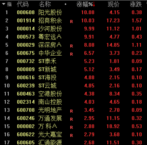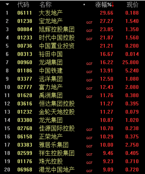 12月5日,多只地产股再迎大涨。其中A股方面,阳光股份、招商积余、沙河股份、粤宏远A涨停,深深房A、中华企业、ST泰禾、ST新城涨幅均超5%;港股方面,大发地产和宝龙地产分别上涨29.66%和27.27%,旭辉控股集团、时代中国控股、中国置业投资的涨幅均超过20%,龙湖集团、远洋集团、富力地产等12只地产股涨幅均超10%。