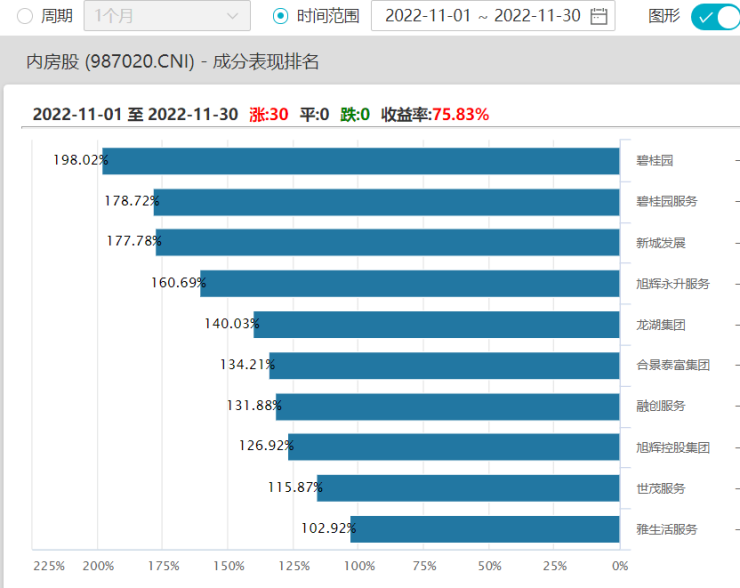 其中A股方面,中交地产股价在11月23日至12月1日期间走出“7连板”走势,中国武夷在11月24日至12月2日期间走出“6连板”行情;港股方面,碧桂园股价在11月1日创下1.0港元的新低后,随后便开启上涨行情,11月累计上涨198%;龙湖集团、合景泰富11月的累计涨幅均超130%。