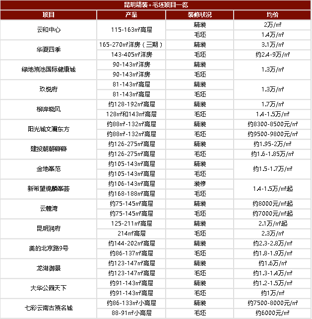 从昆明既有精装房也有毛坯房的项目可以看出,基本为高层产品,仅有华夏四季和绿地滇池国际健康城为洋房产品。