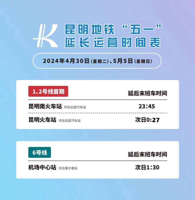“五一”假期将至,昆明地铁结合过往节假日客流特点,加大运力,延长运营时间,保障乘客便捷安全出行。