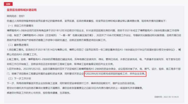 今年4月29日,领导留言板呈贡住建局再次回复:A5-2地块正组织竣工验收,待取得竣工验收备案证明后即可向业主交房,同时要求企业在2022年6月30日前完成项目的验收工作。