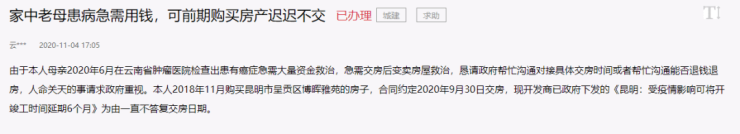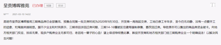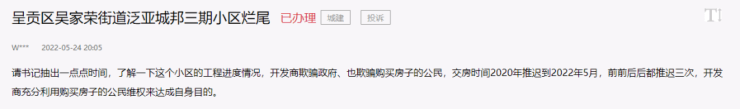 但今年年初,仍然有业主在领导留言板反映项目仍未交付,本月还组织了维权行动,期望能对开发商施压,尽快完成收尾工作。