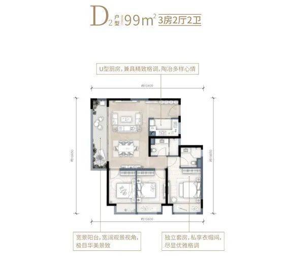 99㎡D2户型为三室两厅设计,餐客厅为超大横厅设计,延伸宽景阳台,视野优质;U型厨房,功能性更佳;主卧为独立套房设计,不仅搭配270°超大广角飘窗,还有独立卫生间、私享衣帽间;两间次卧均带有大飘窗,采光采阳也不错。