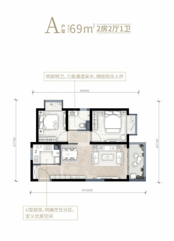 项目做了约69㎡的2房1卫低门槛小户型设计,首付9万起,月供1700左右就能入手。