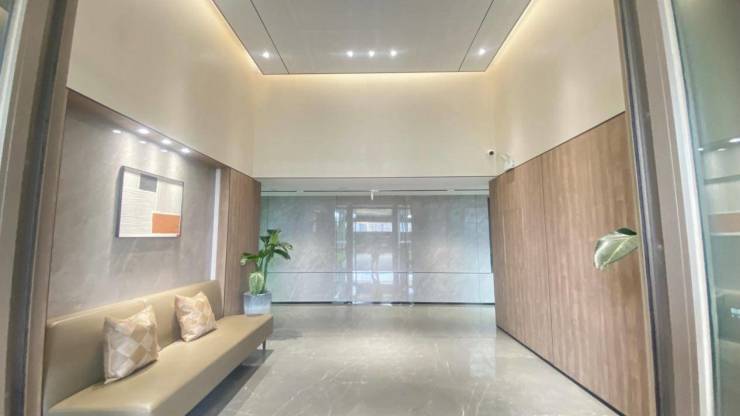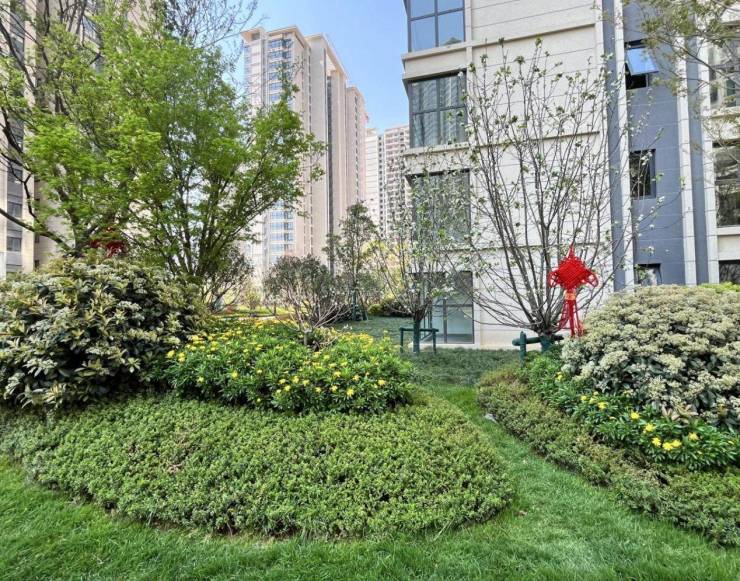 实地走访华夏金地·世博⼀号,进入项目自然景观便映入眼帘,紧挨世博园的绿氧园林充满自然的生气。