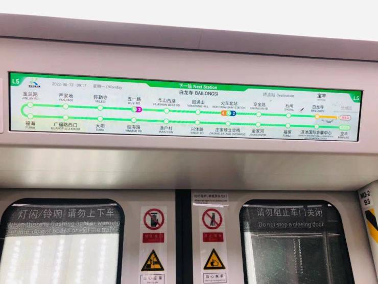 地铁5号线内有全球首创的区间隧道广告系统,每节车厢设有6块80寸、4k高清移动大屏,每列地铁列车内的大屏每天耗电不超100度。为了契合地铁5号线沿线旅游站点较多的特点,大屏播放的画面有蓝花楹、西山等昆明特色画面。