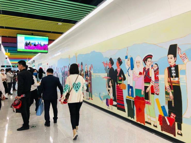 该站艺术文化墙以文化瓷砖为媒材,以云南省26个世居民族以及周边风景滇池和西山为主要表现内容,色彩丰富、肌理多变,呈现了云南省的丰富多样民族文化特色,表达了各民族团结、进步、安居乐业、热情好客的主题。
