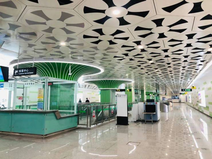 以“人与自然和谐共处”为主题思路,将柱面与顶面一体化设计,抽像提取植物花瓣的元素进行阵列组合,在墙面上运用绿色梯田、柱子予以绿色树冠造型的开放、包容、向上、结合、发展的寓意上,顶面利用花瓣镂空的设计来满足车站通风排烟的需求,同时还能形成具有独特生态美感的车站艺术效果。