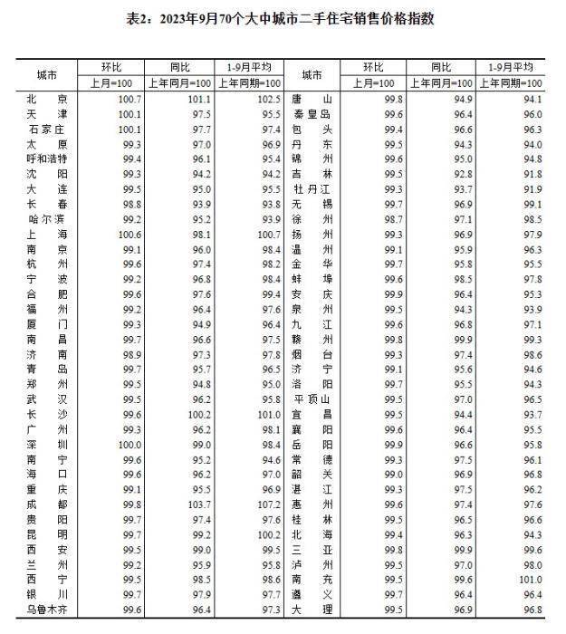 2023年9月70个大中城市二手住宅销售价格指数。 截图自国家统计局官网