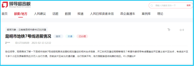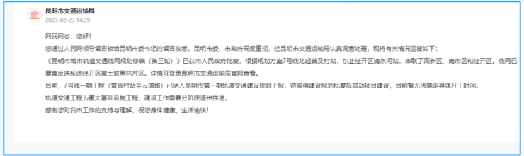 有网友在人民网领导留言板留言中提到:想具体了解一下昆明市地铁7号线报规具体进展和规划建设的相关站点信息,开工时间及建设周期等情况。2月23日,昆明市交通运输局对此进行了回复。