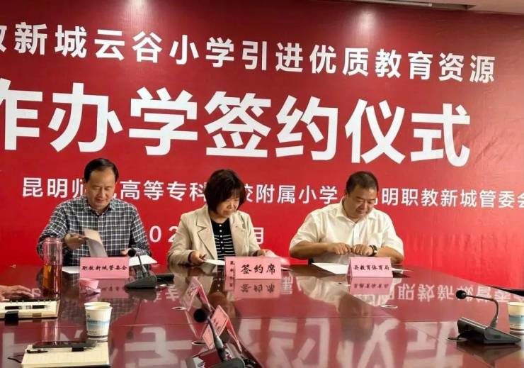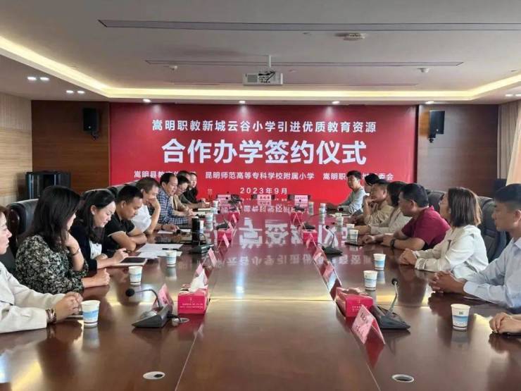 嵩明县政协副主席、县教育体育局局长李秋彦与昆明师专附小教育集团、职教新城负责人签订合作办学协议,由昆明师专附小教育集团领办职教新城云谷小学。