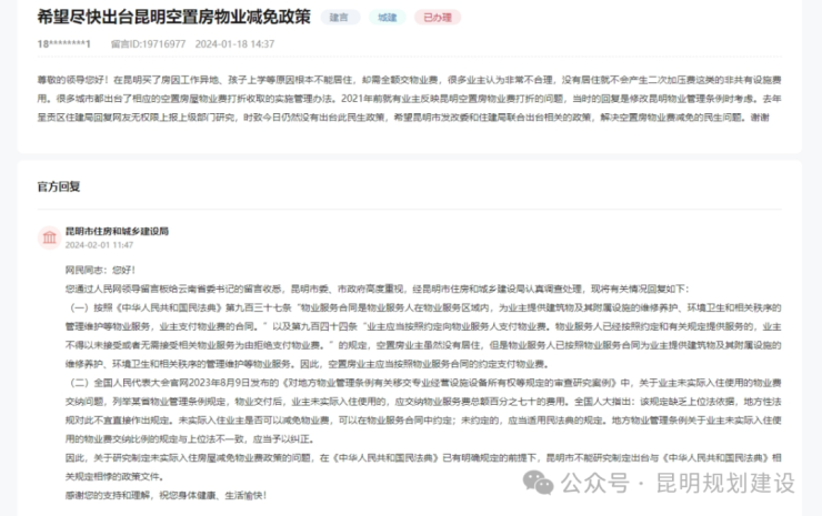 去年呈贡区住建局回复网友无权限上报上级部门研究,时至今日仍然没有出台此民生政策,希望昆明市发改委和住建局联合出台相关的政策,解决空置房物业费减免的民生问题。